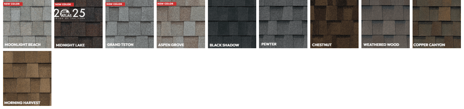 Color options include: Moonlight Beach, Midnight Lake, Grand Teton, Aspen Grove, Black Shadow, Peqter, Chestnut, Weathered Wood, Copper Canyon, Morning Harvest