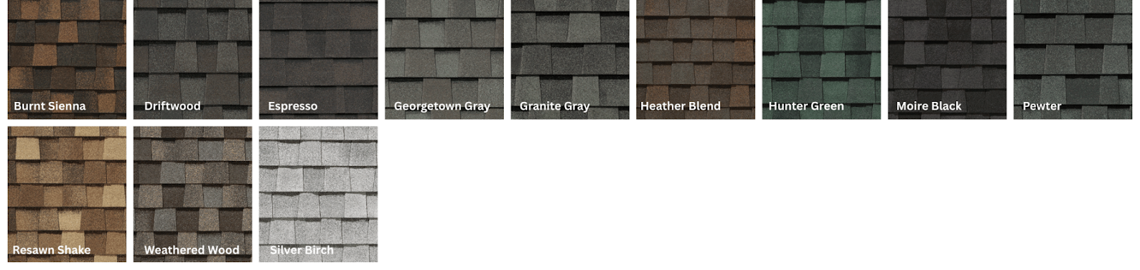 Color options include: Burnt Sienna, Driftwood, Espresso, Georgetown Gray, Granite Gray, Heather Blend, Hunter Green, Moire Black, Pewter, Resawn Shake, Weathered Wood, Silver Birch