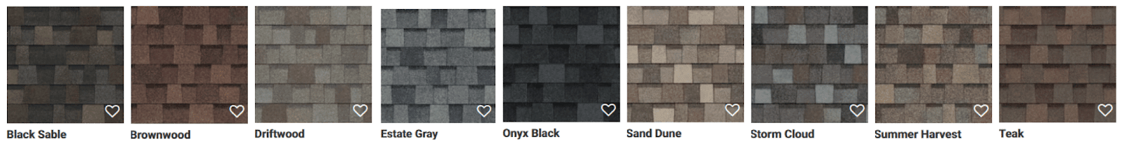 Color options include: Black Sable, Brownwood, Driftwood, Estate Grey, Onyx Black, Sand Dune, Storm Cloud, Summer Harvest, Teak